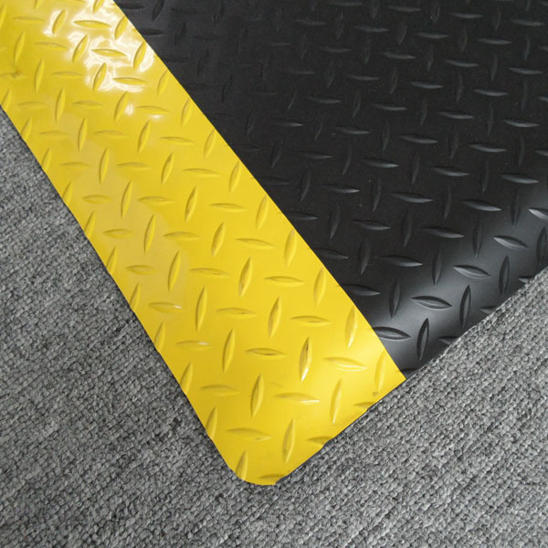 抗疲勞地墊為黑色加黃色,鋼花紋表面防滑效果,可做全黑色,黃色為警示作用,可根據客戶要求加上防靜電標志以及防靜電接地扣母扣,