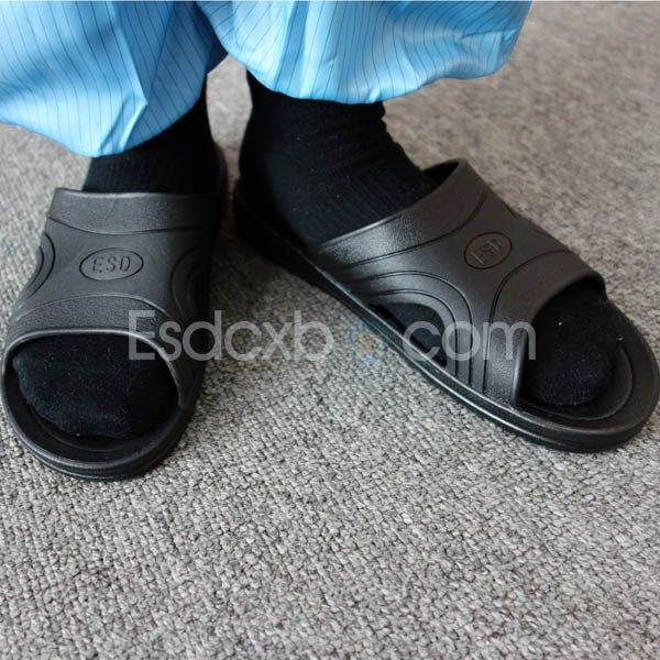 通過穿防靜電兩孔拖鞋及防靜電地面(防靜電地墊、地毯等)等,使人體的靜電荷從人體導向大地,從而消除人體靜電。